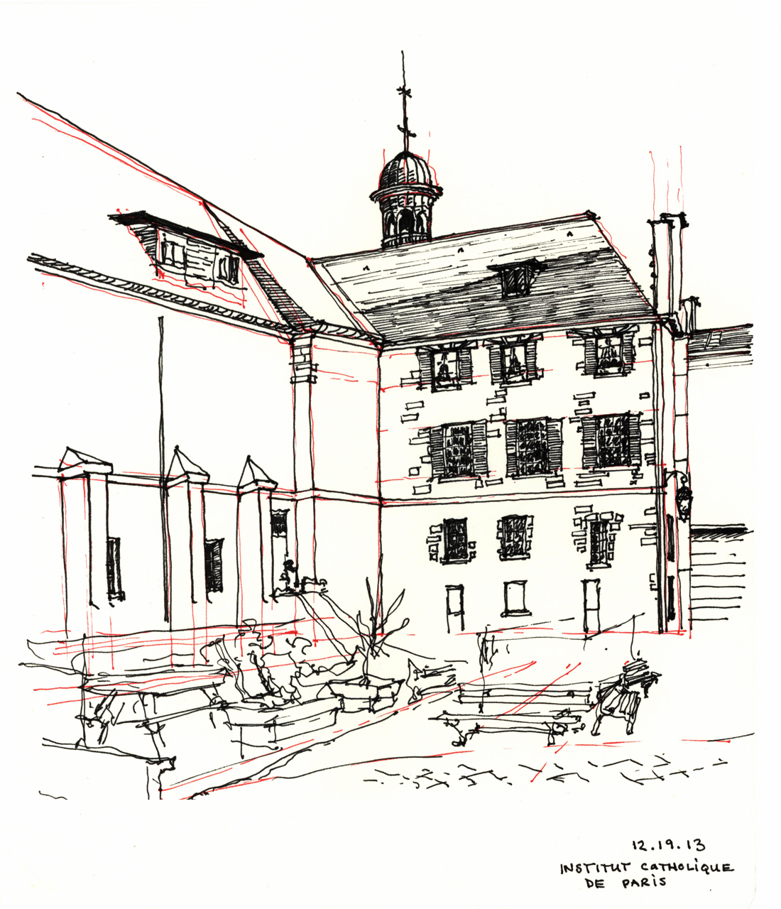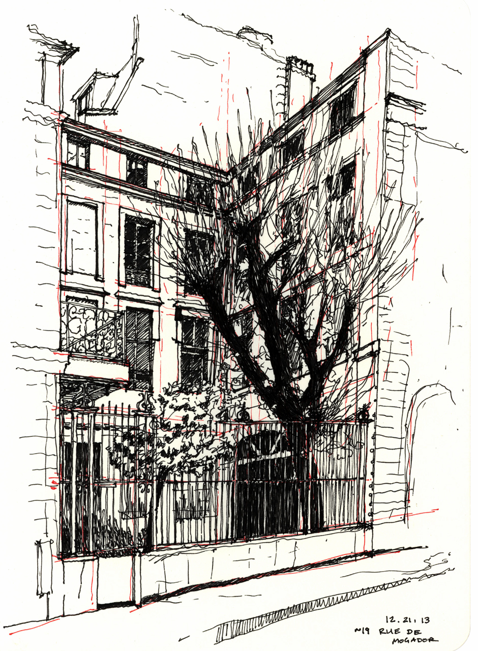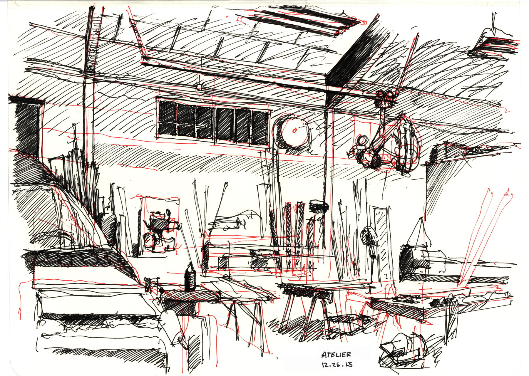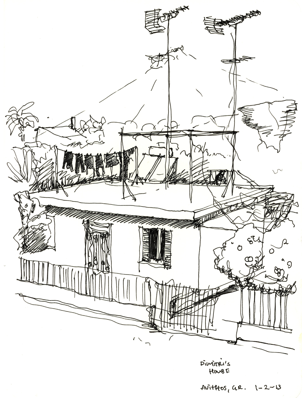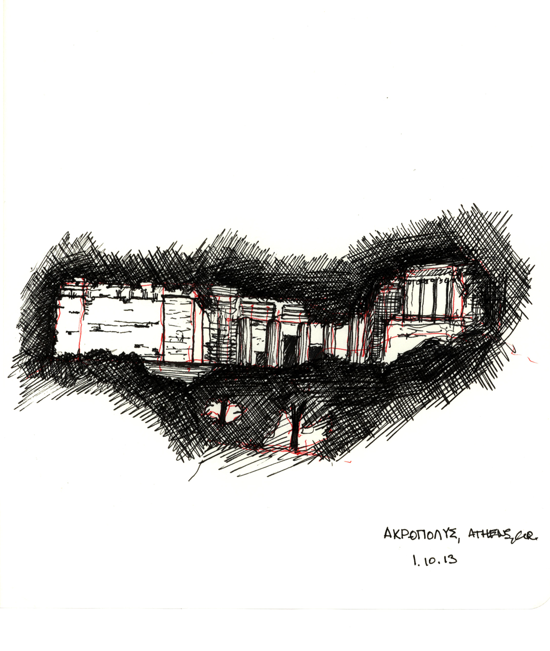 Simple drawings in black and red pen. These sketches were done while traveling in France and Greece in December 2013 and January 2014.
