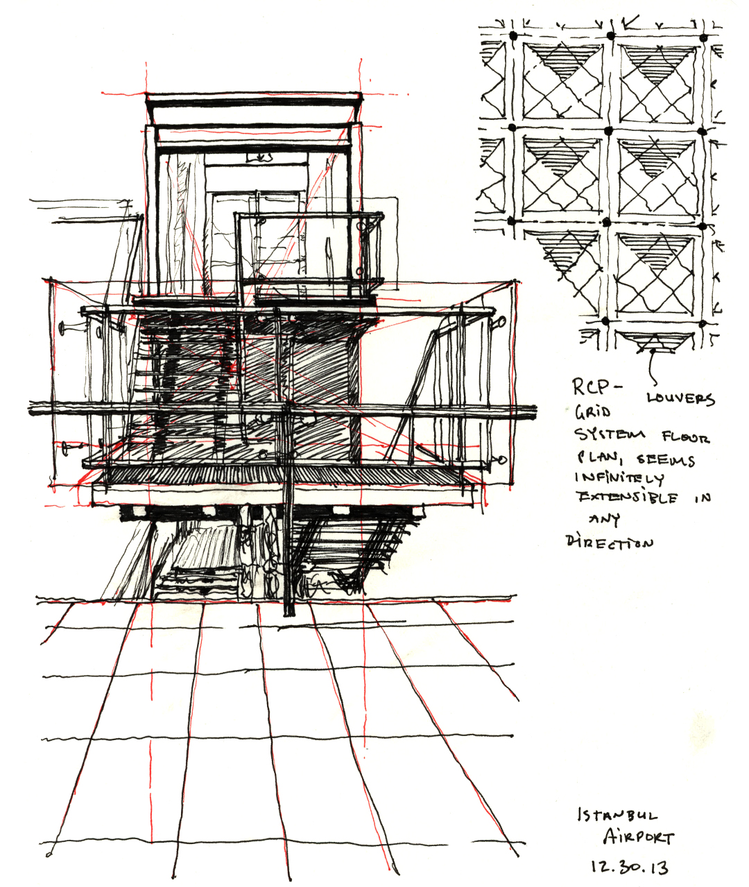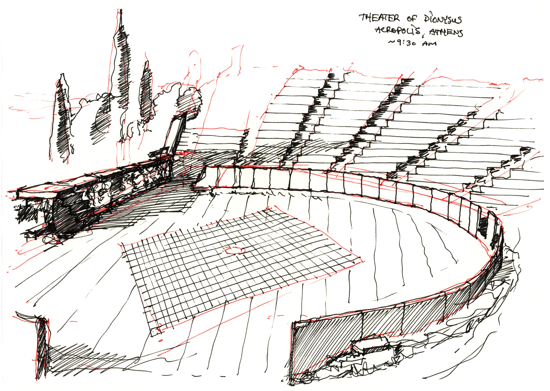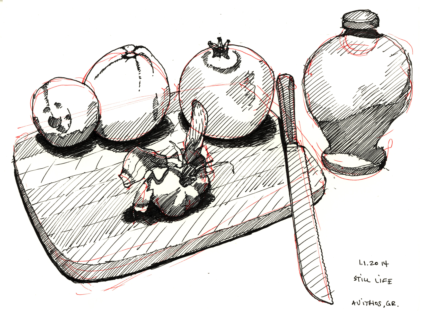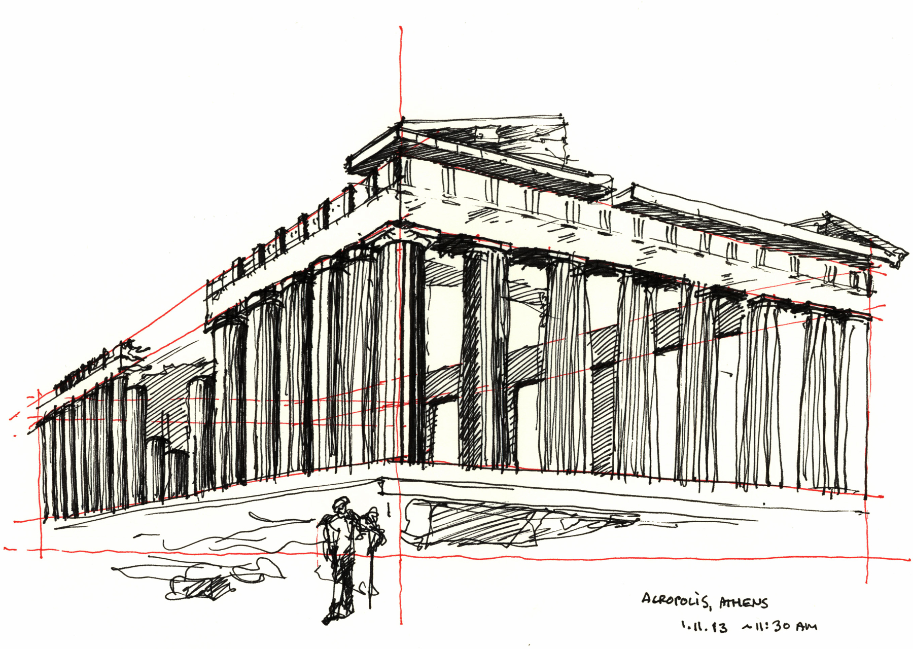 Simple drawings in black and red pen. These sketches were done while traveling in France and Greece in December 2013 and January 2014.